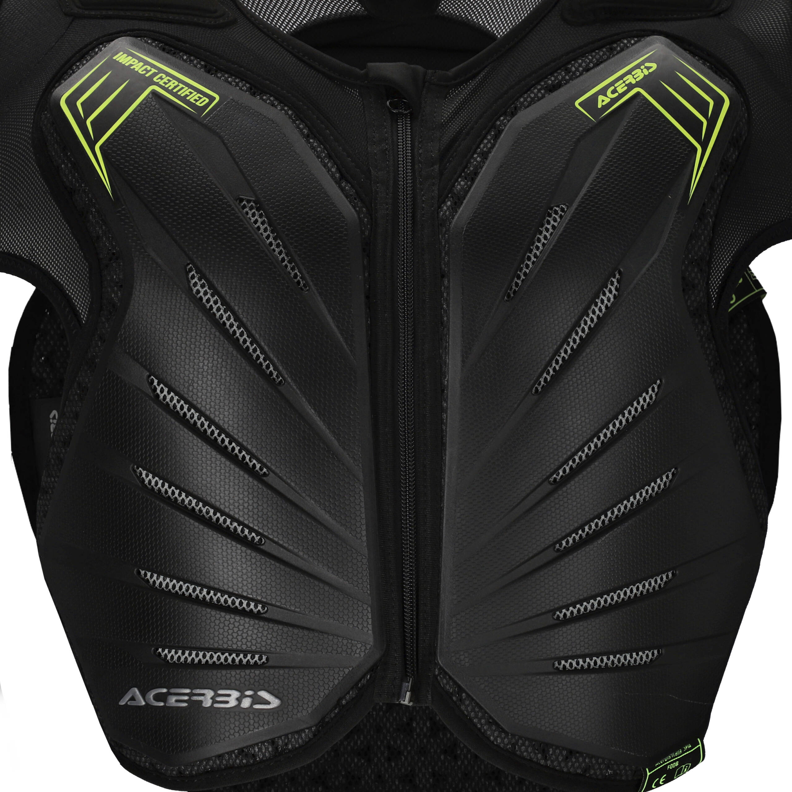 Insertie cu logo Acerbis pe plastic din fata si din spate. Etichete cu cusaturi in bucla omoloage sub plastic pe piept, spate, umarul stang si cotul stang.